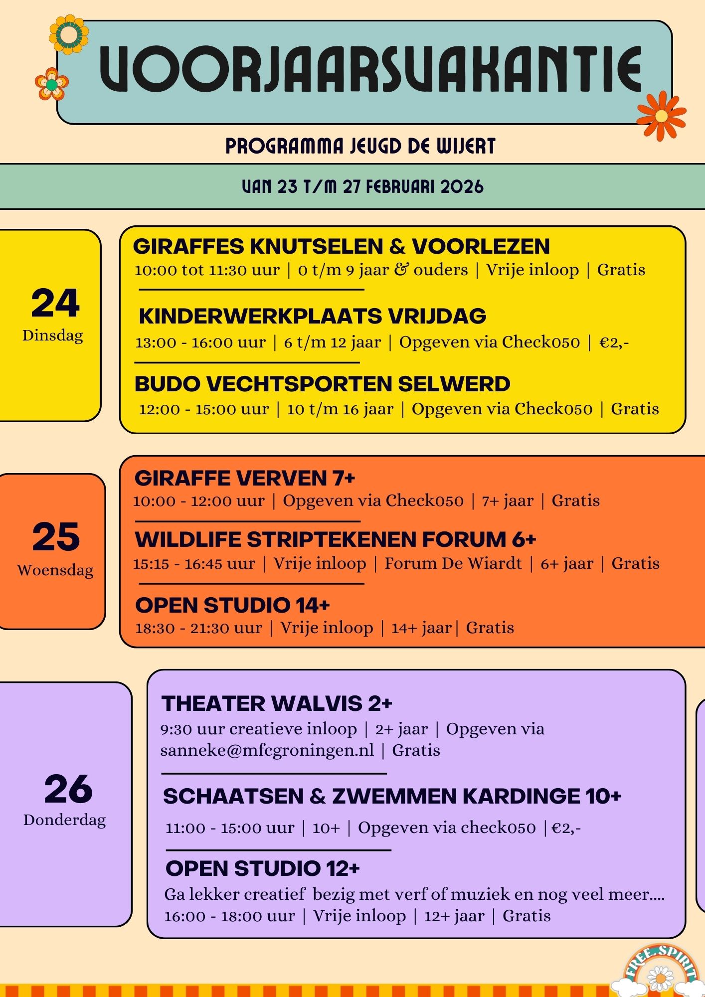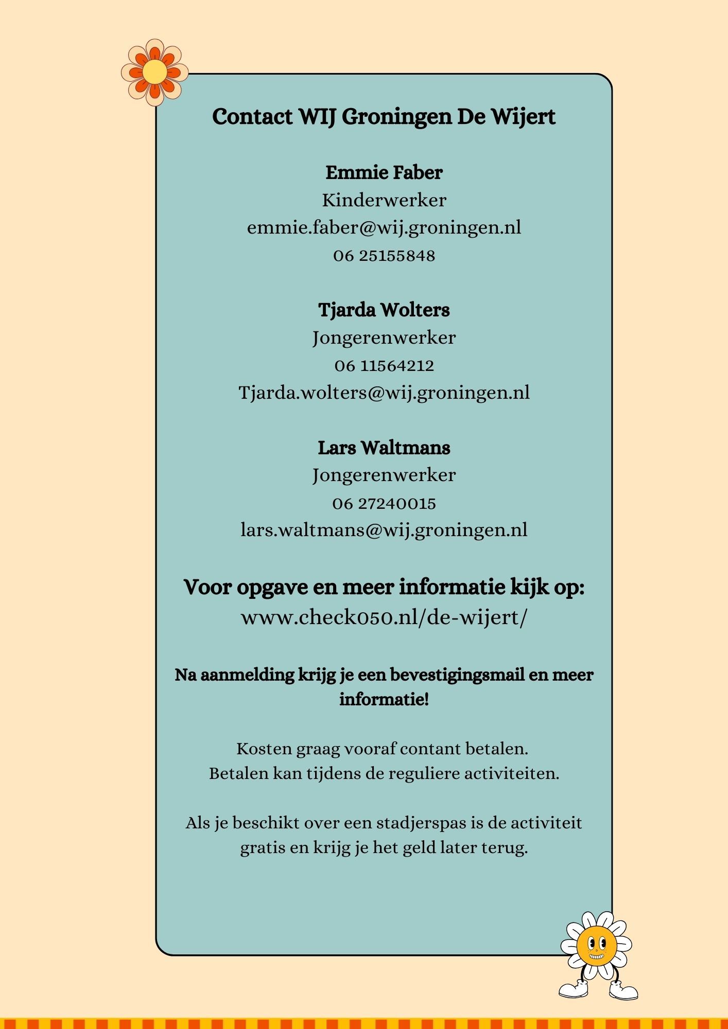 Zorg dat je om 11:00 uur bij Kardinge staat met je zwemkleding. Mocht vervoer niet lukken, neem dan contact op met Tjarda Wolters. Een paar dagen van te voren ontvang je een mail met extra informatie.