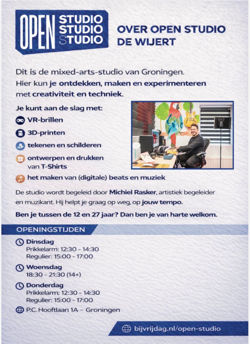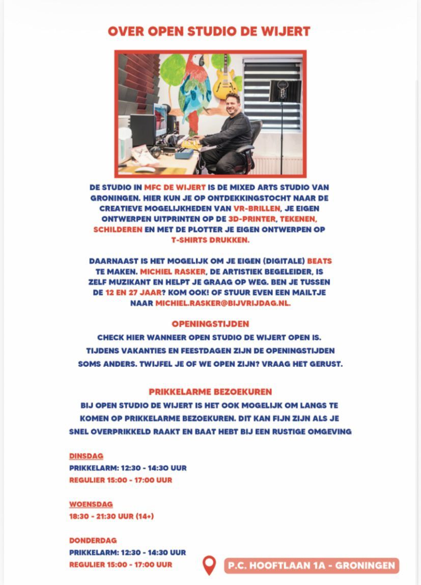 Muziek maken/opnemen, 3D printen, T-shirts bedrukken, (digitaal) tekenen en schilderen, virtual reality en nog veel meer....